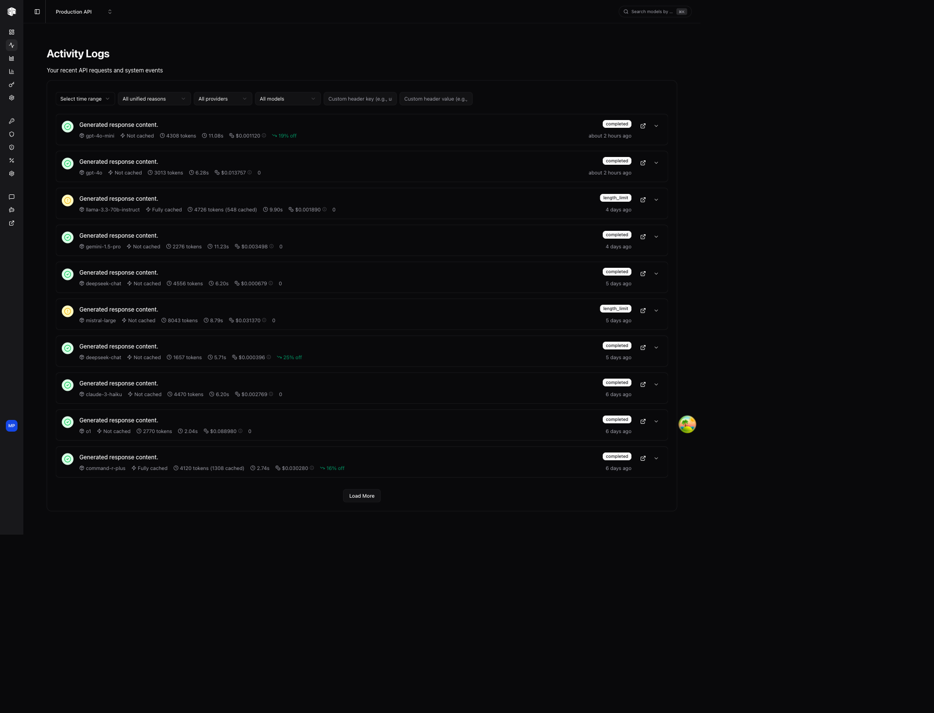 The Activity page shows a real-time log of every API request routed through LLM Gateway. Use it to debug requests, monitor performance, and track costs per call.