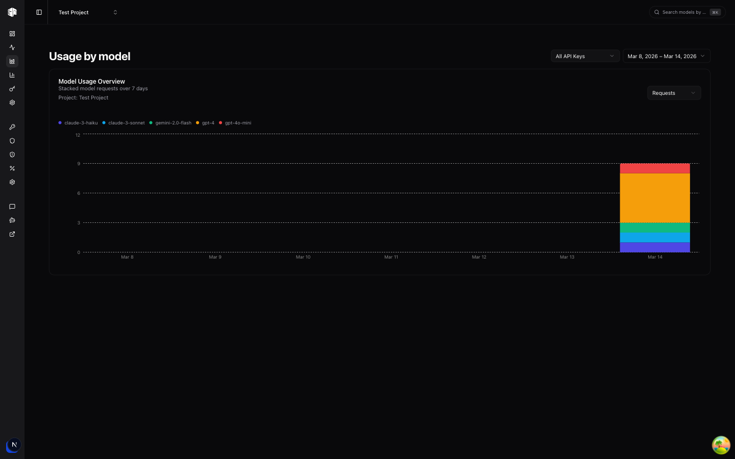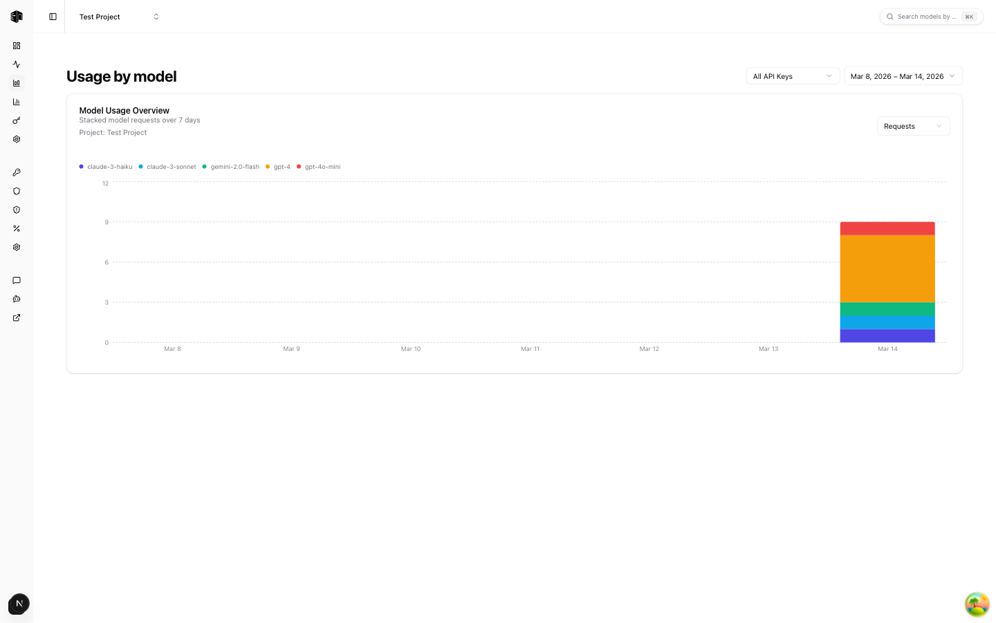 The Model Usage page shows how your API requests are distributed across different LLM models over time.