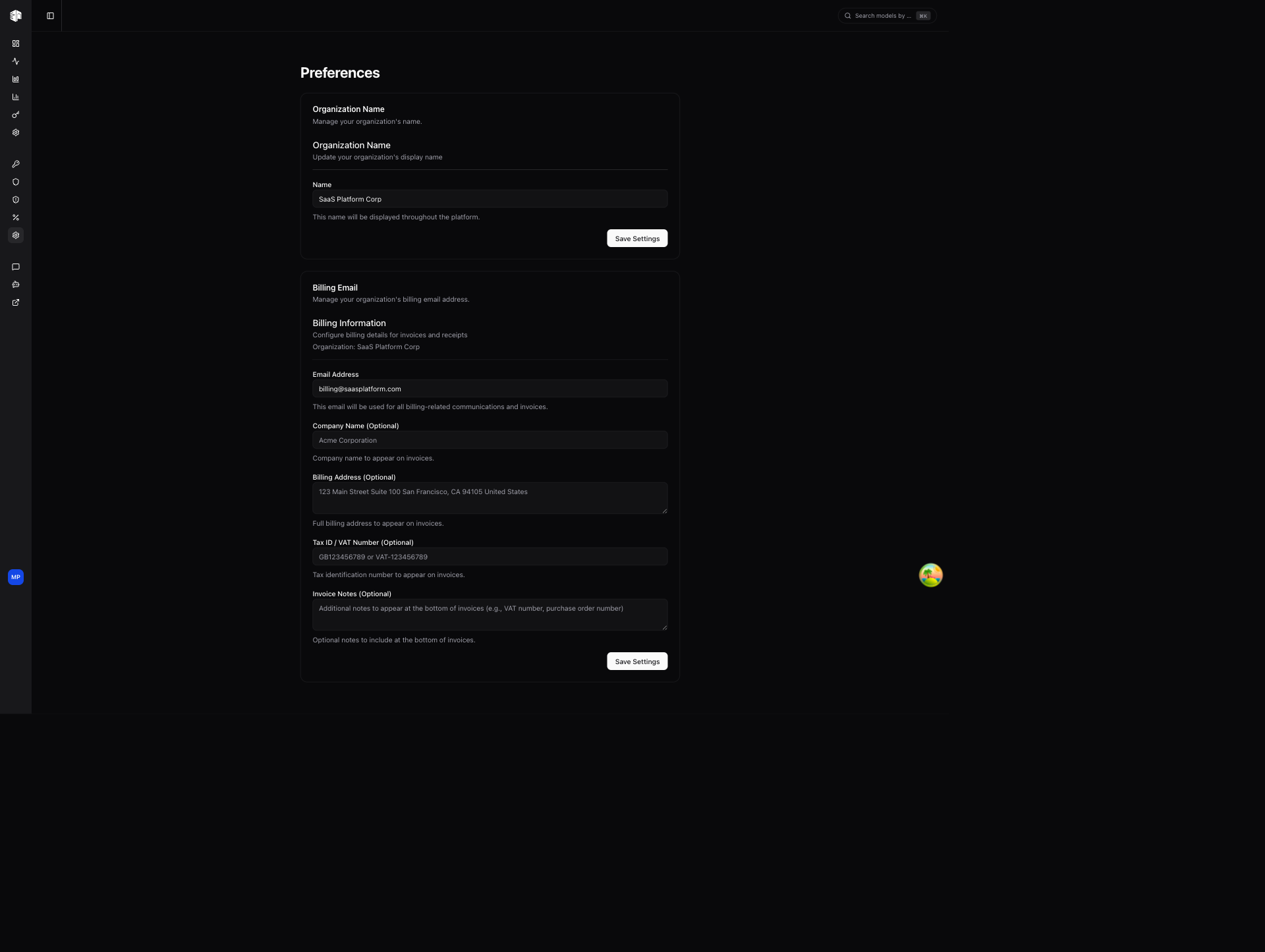 Update your organization's display name. This name appears throughout the dashboard and in billing communications.