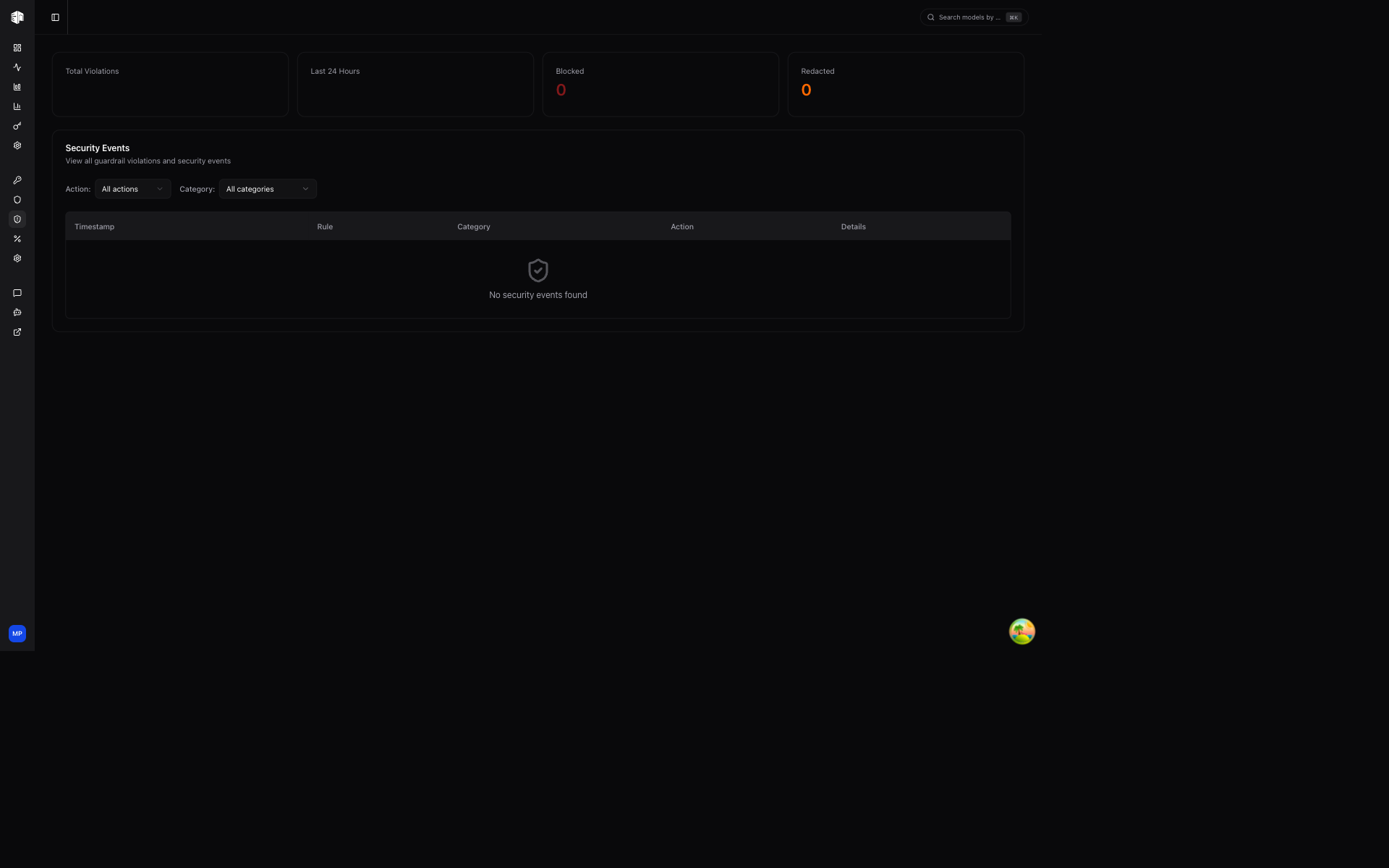 The Security Events page shows all guardrail violations detected across your organization, helping you monitor content safety and policy enforcement.